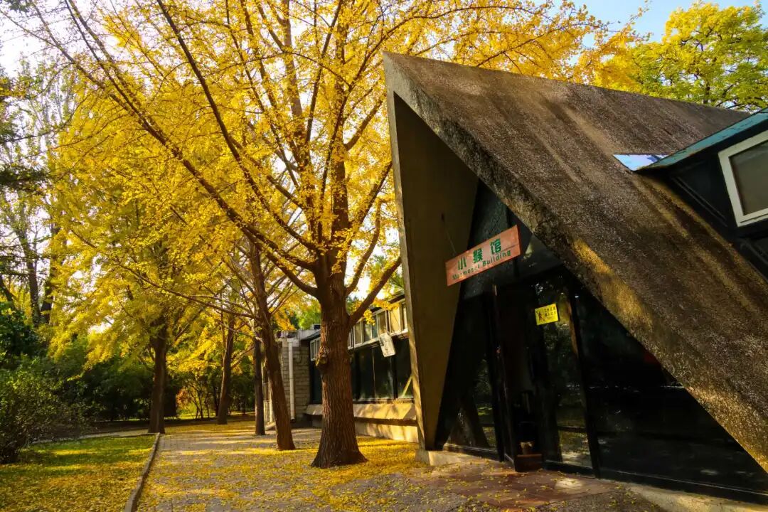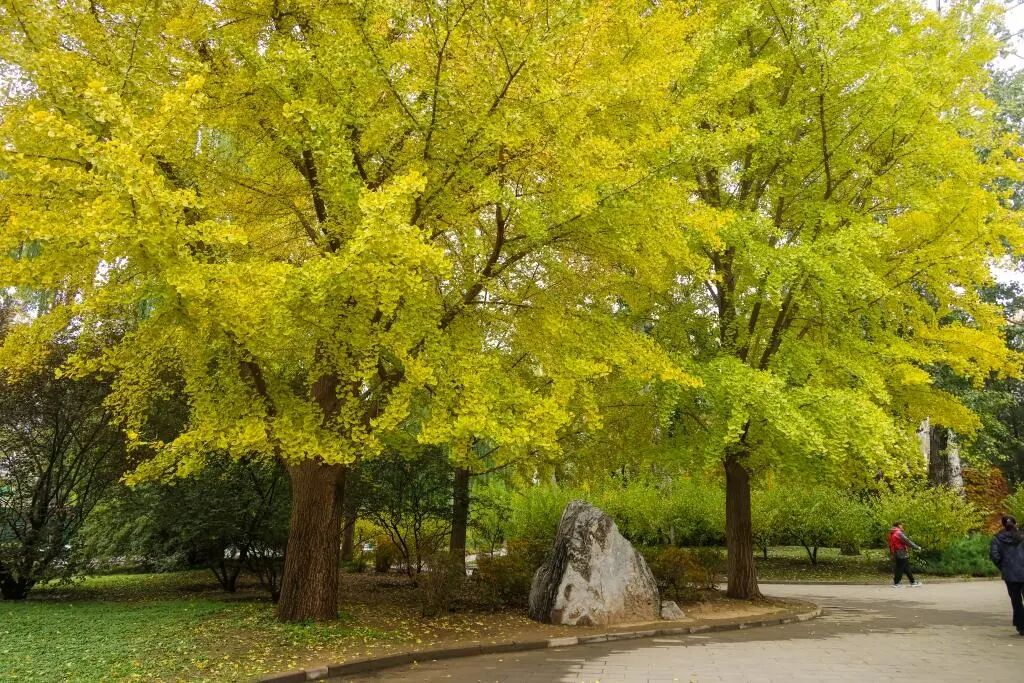 数十株高大银杏组成银杏林,秋季叶色金黄、落叶缤纷,在阳光下更为耀眼。